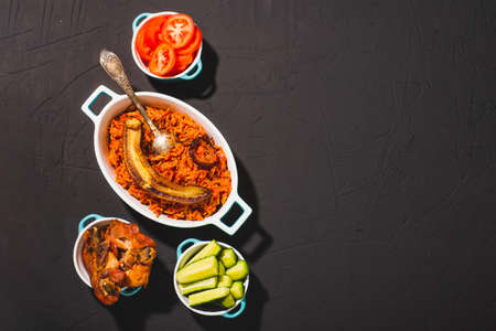 Jollof rice with fried banana, baked chicken. Rice with tomatoes, onions, spices. Traditional national Nigerian food. dark background. view from above. Place for text.