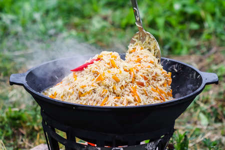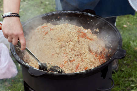 Cooking pilaf in a cauldron on the grill outside in the summer