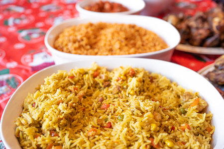 jollof rice with chicken and fried plantain, west african cuisine