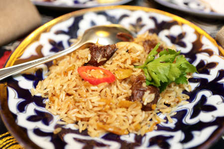 Plate with pilaf in an uzbek restaurant