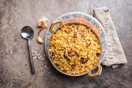 Traditional pilaf with meat and spices on a dark background. Selective focus.