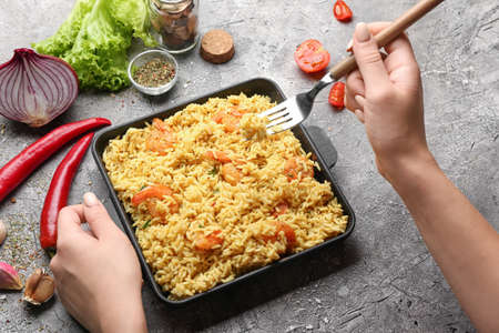 Woman eating tasty pilaf on table