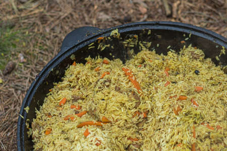 Pilaf cooked in a cauldron outdoors on a fire with garlic close-up