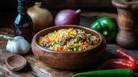 Rustic setting with beef fried rice in a clay bowl, surrounded by peppers, onions, and soy sauce bottle