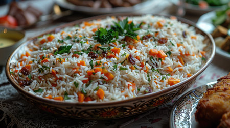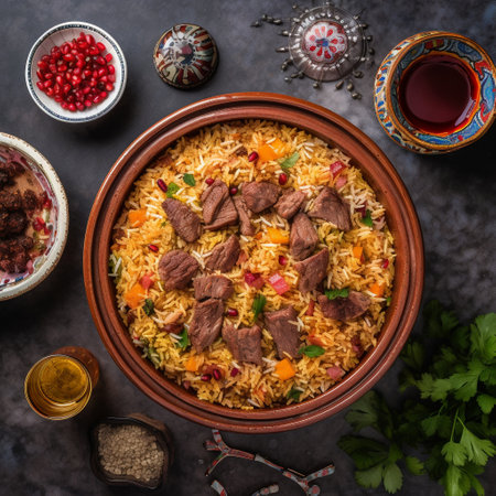 Indulge in the flavors and aromas of Tajikistans signature rice pilaf, Osh, with this colorful and fragrant bowl of tender pieces of lamb or beef and a variety of spices. The image is captured from a top-down perspective, showcasing the vivid colors of the ingredients, such as carrots, raisins, and chickpeas, and their unique blend of spices, such as cumin, coriander, and turmeric. The bowl of Osh is placed on a brightly patterned tablecloth, evoking a festive and communal dining experience. Smaller bowls of yogurt, pickles, and fresh herbs are arranged around the main dish, adding more visual interest and showcasing the unique flavors of Tajikistan cuisine. The emotions evoked by this image are warmth, joy, and togetherness.