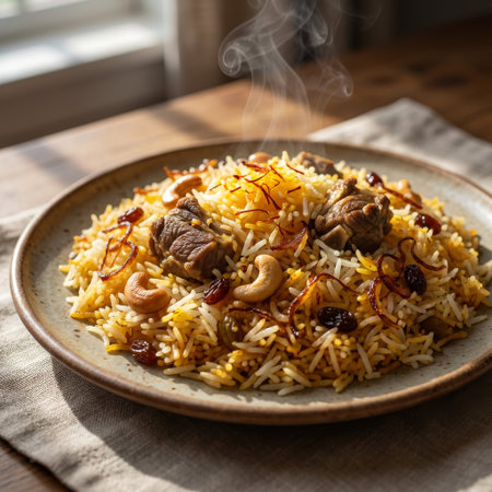 A close-up of a steaming plate of authentic lamb biryani. The aromatic dish features saffron rice, tender mutton, cashews, and raisins, served on a rustic plate in warm daylight.