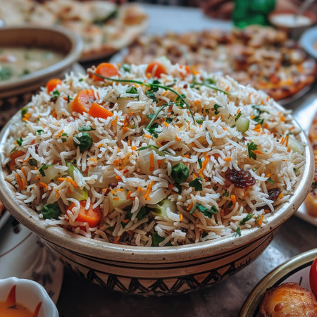 An inviting bowl of vegetable biryani is presented, surrounded by an array of colorful Indian dishes during a festive gathering.