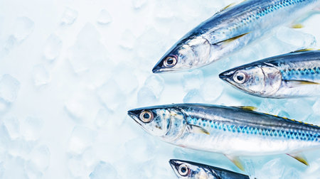 Mackerel fish displayed in photo-realistic detail with vibrant colors. Set against a white background highlighting freshness and quality. Concept of culinary arts, seafood markets, health food.