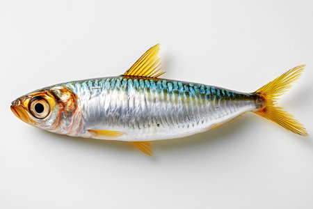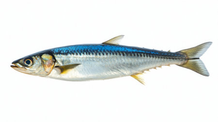 close up view of a Herring showcasing its unique features set against a plain white background. This species known for its silvery color represents a vital part of marine ecosystems.