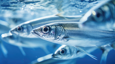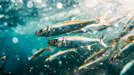 A blurred dynamic school of small silver sardine fish swimming together in the vibrant blue green depths of the ocean The sardines are moving in a fluid schooling motion