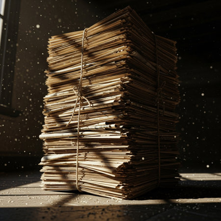 Tightly bound bundle of aged newspapers ready for recycling, lit by harsh cinematic sunlight. Earth