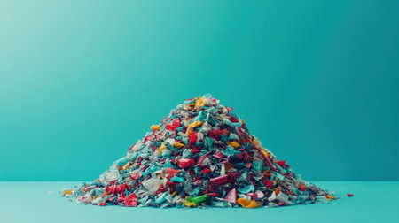 A striking image of a large pile of mixed garbage and waste against a vibrant solid color background, highlighting the critical issues of pollution and recycling challenges in modern society.