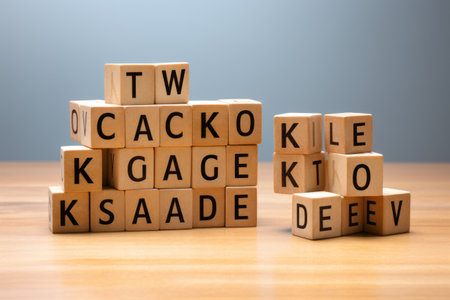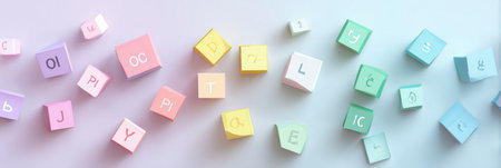 Colorful alphabet blocks in soft pastel shades are creatively arranged on a smooth surface, ideal for a learning space.