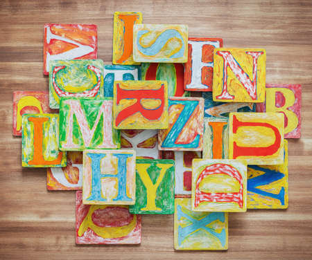 Random color wooden alphabets pile on wood background