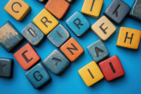 Wooden letter tiles in various colors are scattered creatively showcasing the letters and adding a playful touch to the blue surface.