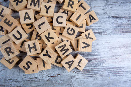 Colorful wooden cubes with letters on the wooden table.
