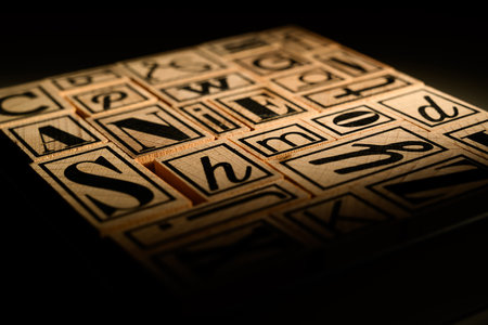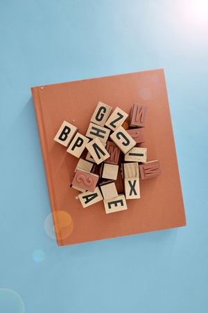 Wooden toy blocks with letters on the table in the dark room
