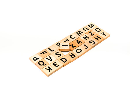 Many wooden cubes with letters on red background