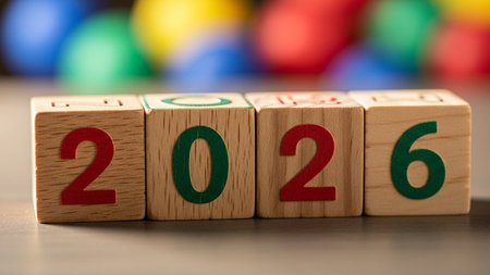 Wooden blocks displaying business growth icons, financial savings symbols, a target goal, the year 2026, representing future planning, economic strategy, investment forecasting, long-term objectives.