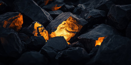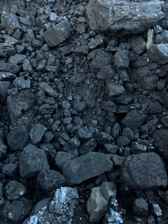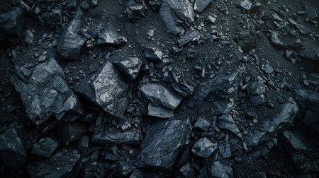 Dark, rugged coal rocks create a striking and textured surface in natural lighting.