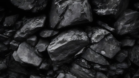 A close-up captures multiple dark rocks with rough, textured surfaces. The grayscale palette emphasizes their depth and rugged appearance. Soft lighting creates subtle shadows. Suitable for illustrating geology, natural resources, or environmental themes. Offers visual appeal for various commercial or editorial applications.