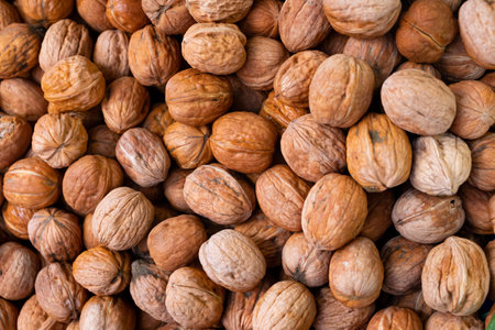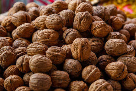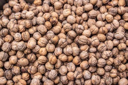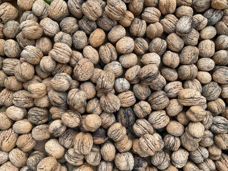 Crude walnut with nutshell. Walnuts in market lying in the sun and dries. Background of walnuts. Healthy walnuts. Fresh walnuts. Walnut pattern and texture, scattered pile of walnuts.