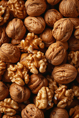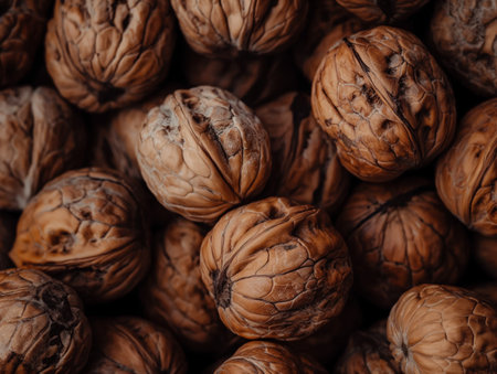A macro shot capturing the rich textures and natural patterns of a pile of walnuts.