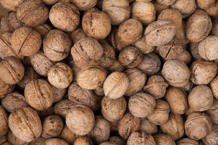 Natural Walnuts with shell background pattern texture. Background of fresh walnuts in shell