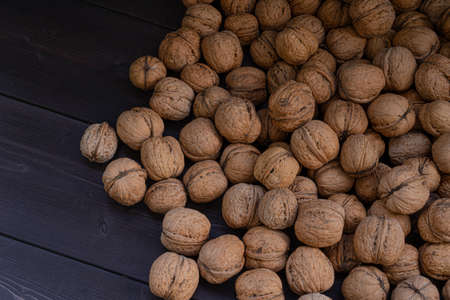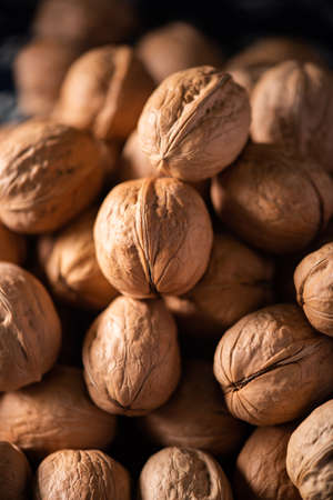 Walnuts background. Tasty nut is diet snack. Close-up. Copy space. Healthy food. Drying harvest. Useful brain nutrients. Brown color. Wallpaper. Banner. Beautiful still life on dark backdrop. Texture.