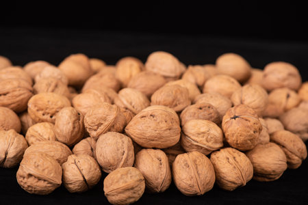walnuts on a black background, you can see a cracked walnut, selective focus.