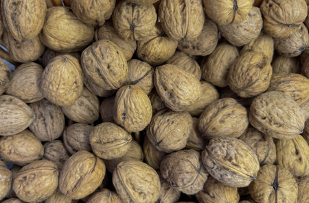 Top down view, whole walnuts displayed on food market in Kyrenia, Cyprus.