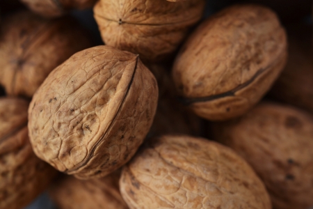Whole walnuts in shell showing organic texture and earthy brown tones