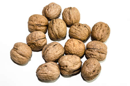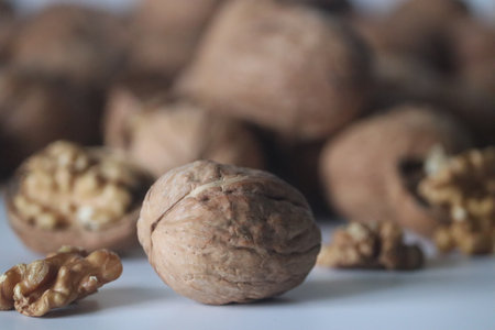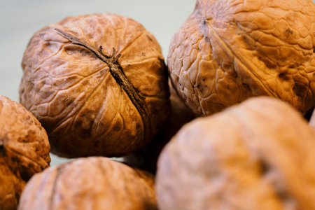 Walnuts in shell, not peeled, scattered throughout the frame, close-up