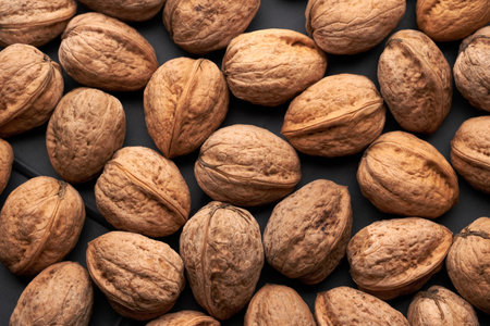Walnuts with and without shells filling the view on dark background. Top view of fresh walnuts. Generative AI.