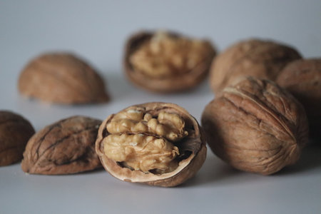Close-up of walnuts and shells on neutral background. Natural healthy food concept emphasizing organic simplicity, rustic texture, and wholesome nutrition.