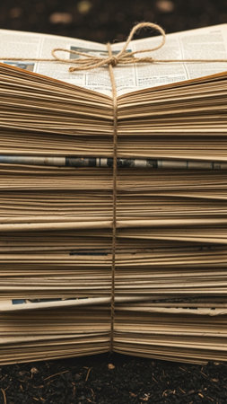 A high-definition, vertical close-up shot of a substantial stack of aged, compressed newspapers dest