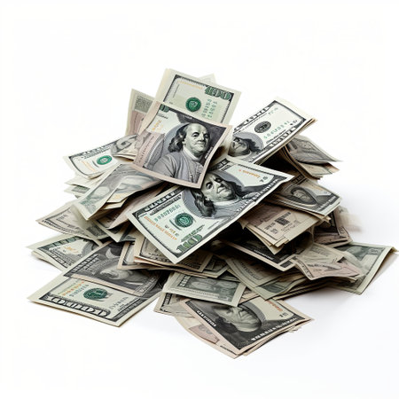 Heap of one hundred dollar bills stacked in a disordered fashion on a plain white background