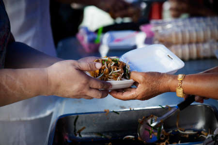 Feeding the poor to hands of a beggar : Concept of famine and social inequality : feeding food for beggar poverty concept : The society of helping to share food to the poor
