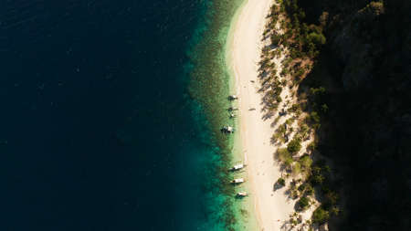 aerial view island with tropical sandy beach and palm trees. Malajon Island, Philippines, Palawan. tourist boats on coast tropical island. Summer and travel vacation concept. beach and blue clear sea water
