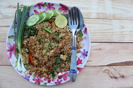 Fried rice on the dish with spoons and forks delicious food for Thai people isolated on wooden background closeup.
