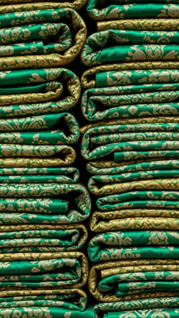 Rich emerald and gold brocade silk fabric, sharply folded, filling 45% of a vertical frame with ample negative space. Luxury textile for Eid.