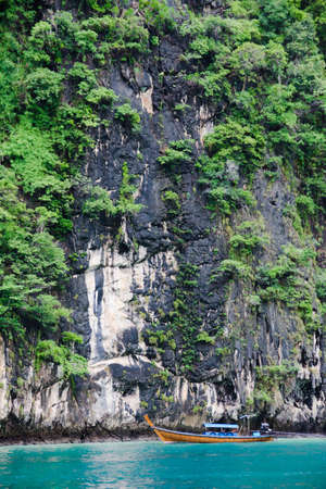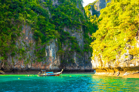 Traditional thai longtale boat at Maya bay in Phi Phi Island. Location: Krabi Province, Thailand, Andaman Sea. Artistic picture. Beauty world.