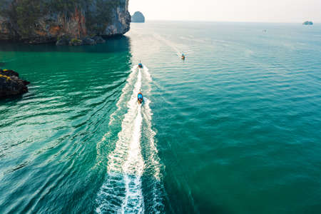 Aerial view of long tail boat in the sea. Krabi, Thailand