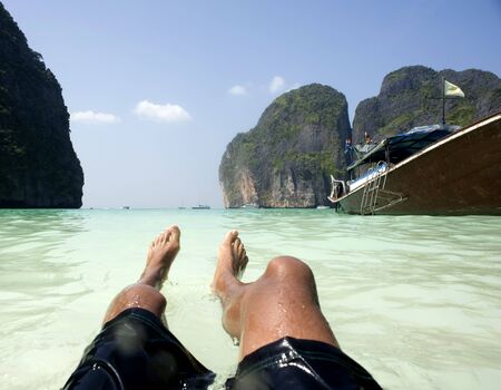 Looking out over paradise. Point of view shot of an unidentifiable tourists feet as he admires an island view.
