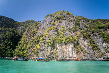 Wooden boats on crystal sea at Loh Samah Bay of Pileh at Phi Phi island in Krabi near Phuket, Thailand. Famous travel destination or summer holiday maker at tropical country, Siam