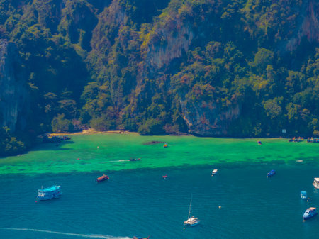 high angle view camera from drone, of Phi Phi Island, Phuket Province during the high season in Thailand.