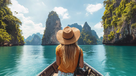 a young lady sitting on a boat on the clear blue water in tai on vacations.