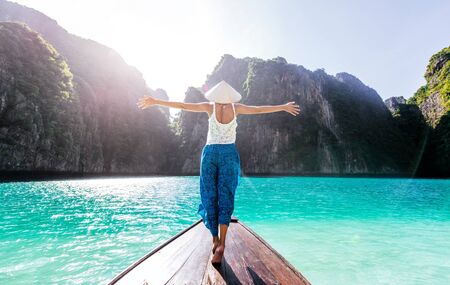 Beautiful woman making an excursion to phi phi island and maya beach in Thailand