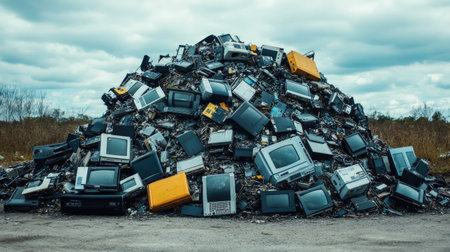 Pile of discarded electronics waiting to be recycled, highlighting the importance of sustainability and eco-friendly practices.