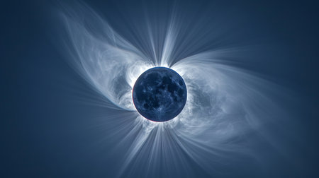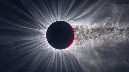 Solar eclipse with bright corona effect in the night sky. Majestic eclipse phenomena with glowing solar light. Concept of astronomical event, celestial wonder, natural spectacle.